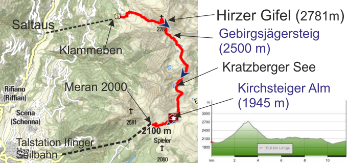 Die Rundwanderung oberhalb von Algund in der Umgebung von Meran beginnt bei der Leiter Alm, wo man den Weg Nr. 24 einschlägt und zum Schutzhaus Hochgang wandert. Hier biegt man nach rechts ab und steigt steil empor bis auf eine Meereshöhe von 2.455 m zur Hochgangsscharte. Achtung: nur für Schwindelfreie geeignet! Von der Scharte ausgehend wandert man weiter oberhalb des Langsees entlang, bis man den Grünsee erreicht. Hier schlägt man den Weg Nr. 6 ein, der ins Spronsertal führt - es empfiehlt sich (im Sommer) eine Einkehr in der Oberkaser Alm auf 2.131 m ü.d.M.