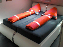Die Idee dabei ist, dass die Betten ohne Hilfsmittel wie Handtücher oder andere Gegenständen hergerichtet werden, um kein Hotelcharakter aufkommen zulassen..