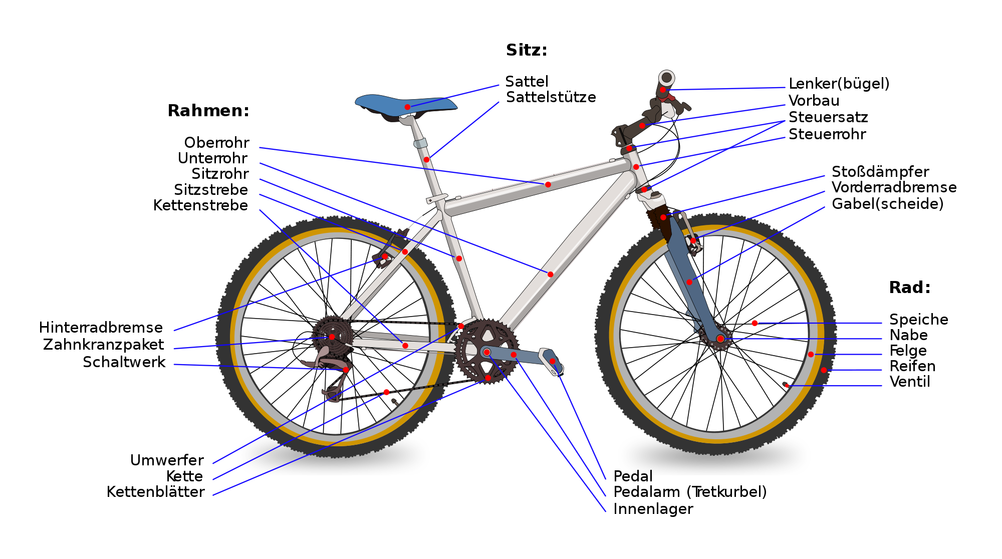 An vielen Mountainbike-Rahmen finden sich auch heute noch Cantilever-Sockel zur Befestigung von Cantilever-Bremsen (V-Bremsen und hydraulische Felgenbremsen sind weitere Bauformen). Heutzutage werden Mountainbikes jedoch oft mit Scheibenbremsen ausgestattet. Federgabeln gehören mittlerweile zur Standardausstattung. Neben der gefederten Vorderradgabel verfügen Mountainbikes immer häufiger auch über eine Hinterradfederung. Ein solches vollgefedertes Mountainbike wird auch Fully (Kurzform für „Full Suspension“) bezeichnet. Das Mountainbike mit ungefedertem Hinterrad wird im Gegensatz dazu Hardtail genannt. Mountainbikes ohne Federgabel sind im Handel praktisch kaum noch erhältlich. Trotzdem werden von einigen Fahrern auch heute noch vollkommen ungefederte Räder ("Starrbikes") bevorzugt.