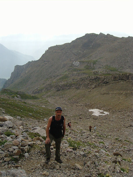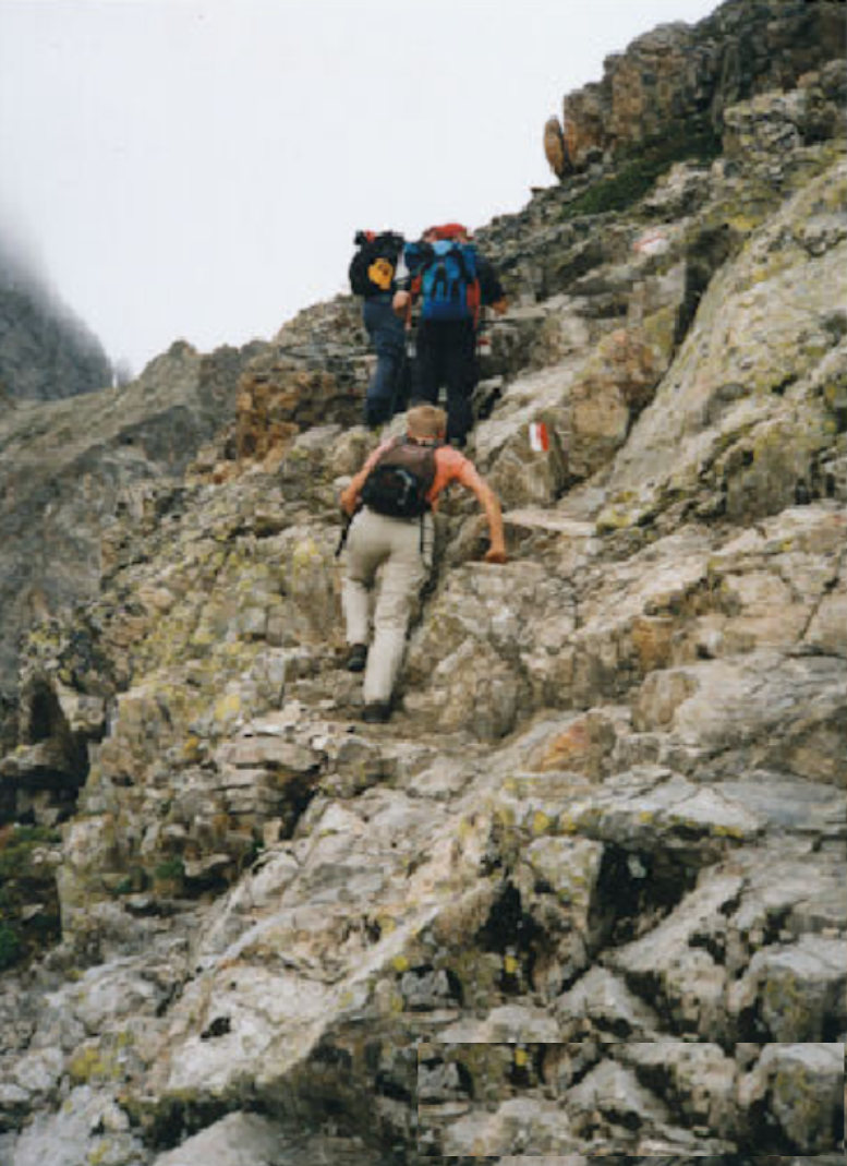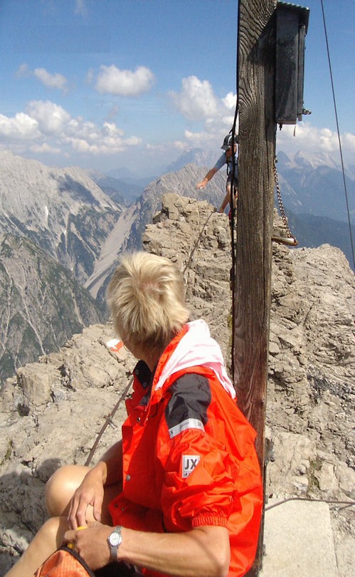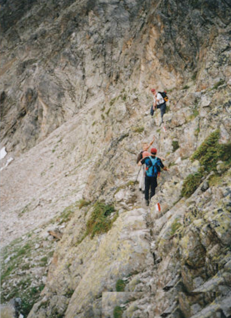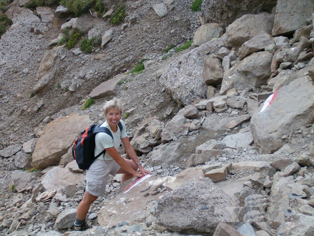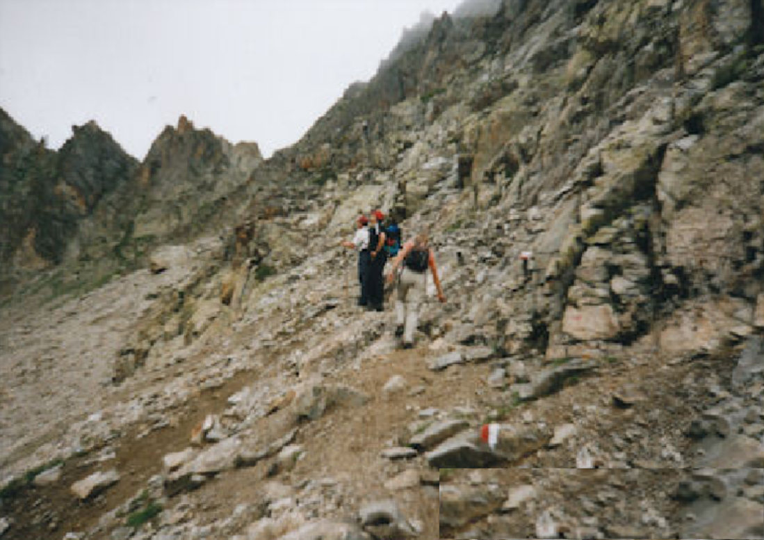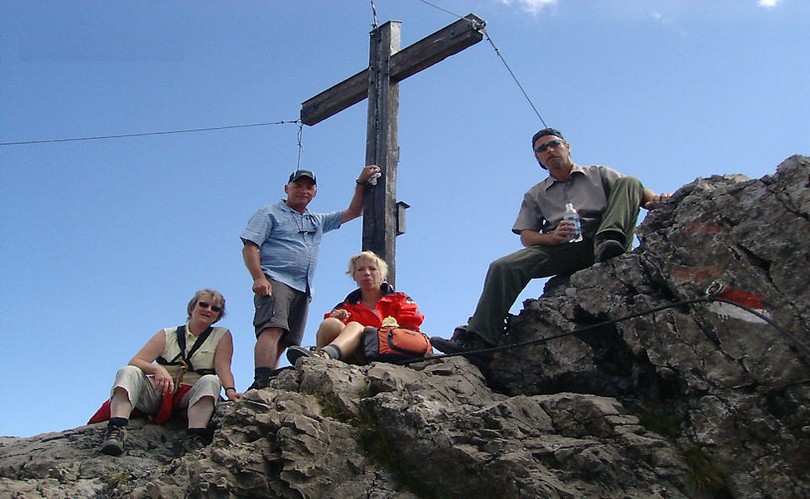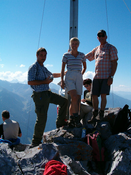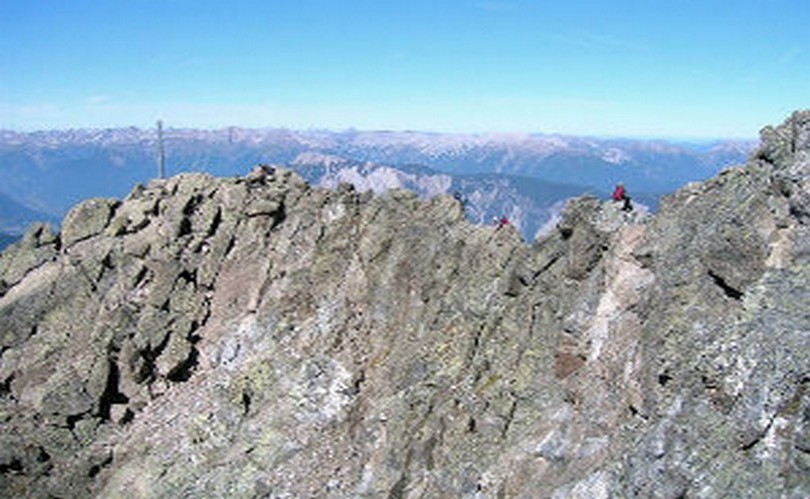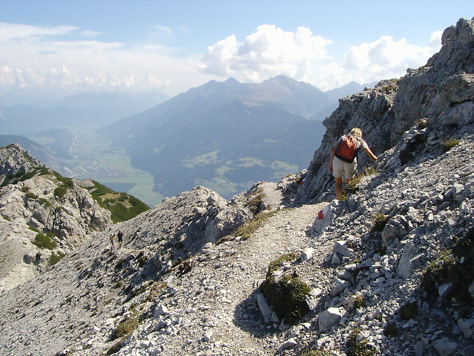 "Narrenkreuz". Bei feuchter Witterung ist dieser Wegabschnitt und der Weiterweg bis zum Felsaufbau nicht leicht zu begehen. Vor dem kreuz zweigt der Plattigsteig nach Westen ab, der Weg zum Gipfel führt in nördlicher Richtung weiter. zuerst etwa zehn Minuten flach dahin, dann steigt man in Serpentinen durch die steile Platteinwiese an. Der Weg zielt direkt unter die Vordere Platteinsüdwand, die in Imst auch "Hakenkreuzwand" genannt wird. Am Wandfuß quert man nach Westen und gelangt, durch eine Felsspalte hindurch, in die Schotterrinne hinter der Südwand. Gerade im Frühsommer ist dieser Bereich oft noch sehr lange mit Schnee bedeckt. Im Schotter nun hinauf zum Sattel. Südseitig erblickt man die vielen kleinen Felspyramiden der "Geisterburg", eine Bezeichnung, die wohl sehr mit dem Aussehen der vielen Türmchen zu tun hat. Vom Sattel quert der Weg in die Ostseite, überschreitet einige Felsrippen und endet dann am Beginn einer Rinne. Direkt unter einem Steilaufschwung biegt der Anstieg nach links ab und führt zu einer Seilversicherung. Diese Selversicherung zieht sich, mit einigen kurzen Unterbrechungen, hinauf bis zum Gipfel der Vorderen Plattein. Für dieses Wegstück benötigen Sie Trittsicherheit und klettertechnische Fähigkeiten.