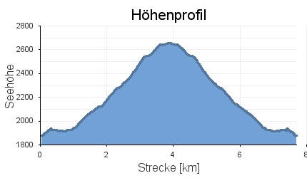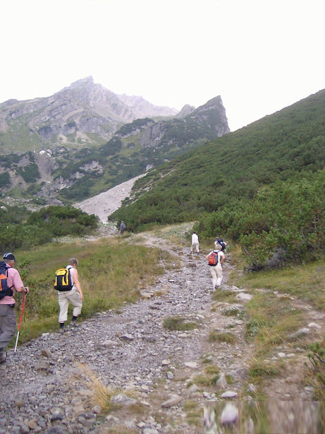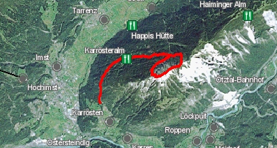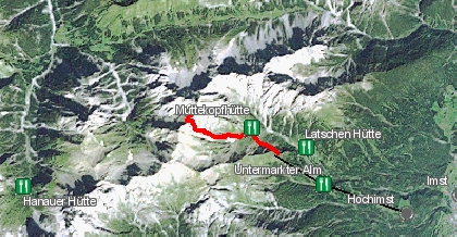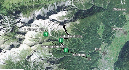 Von der Mittelstation der Imster Bergbahnen geht man zur Latschenhütte. Dort zweigt der Weg direkt nach Norden ab. Entlang des kleinen Baches geht man ca. 80 m hinauf und quert dann diesen Bach. Bis hierher ist der Weg nicht leicht erkennbar, da er gut verwachsen ist, die Markierung ist jedoch ausreichend, bei der Bachquerung ist er dann gut sichtbar. Dieser quert nun den Hang steigend nach osten in den Fichtenwald. Durch den Wald, kommt man auf eine Lichtung, die als "Plasatsch" bezeichnet wird. Am Rande der Latschen zieht der Weg nun hinaus zum "Narren", einem herrlichen Aussichtspunkt auf Imst und das Gurgltal. Über den freien Grasrücken steigt der Weg nun hinauf zum sogenannten