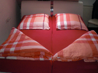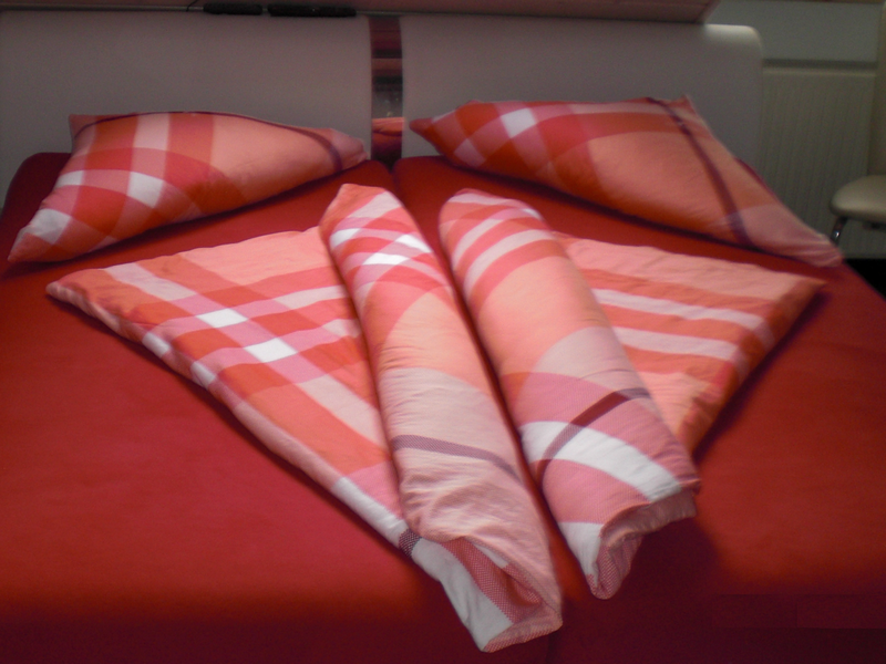 Die Idee dabei ist, dass die Betten ohne Hilfsmittel wie Handtücher oder andere Gegenständen hergerichtet werden, um kein Hotelcharakter aufkommen zulassen..