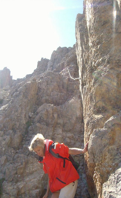 "Narrenkreuz". Bei feuchter Witterung ist dieser Wegabschnitt und der Weiterweg bis zum Felsaufbau nicht leicht zu begehen. Vor dem kreuz zweigt der Plattigsteig nach Westen ab, der Weg zum Gipfel führt in nördlicher Richtung weiter. zuerst etwa zehn Minuten flach dahin, dann steigt man in Serpentinen durch die steile Platteinwiese an. Der Weg zielt direkt unter die Vordere Platteinsüdwand, die in Imst auch "Hakenkreuzwand" genannt wird. Am Wandfuß quert man nach Westen und gelangt, durch eine Felsspalte hindurch, in die Schotterrinne hinter der Südwand. Gerade im Frühsommer ist dieser Bereich oft noch sehr lange mit Schnee bedeckt. Im Schotter nun hinauf zum Sattel. Südseitig erblickt man die vielen kleinen Felspyramiden der "Geisterburg", eine Bezeichnung, die wohl sehr mit dem Aussehen der vielen Türmchen zu tun hat. Vom Sattel quert der Weg in die Ostseite, überschreitet einige Felsrippen und endet dann am Beginn einer Rinne. Direkt unter einem Steilaufschwung biegt der Anstieg nach links ab und führt zu einer Seilversicherung. Diese Selversicherung zieht sich, mit einigen kurzen Unterbrechungen, hinauf bis zum Gipfel der Vorderen Plattein. Für dieses Wegstück benötigen Sie Trittsicherheit und klettertechnische Fähigkeiten.